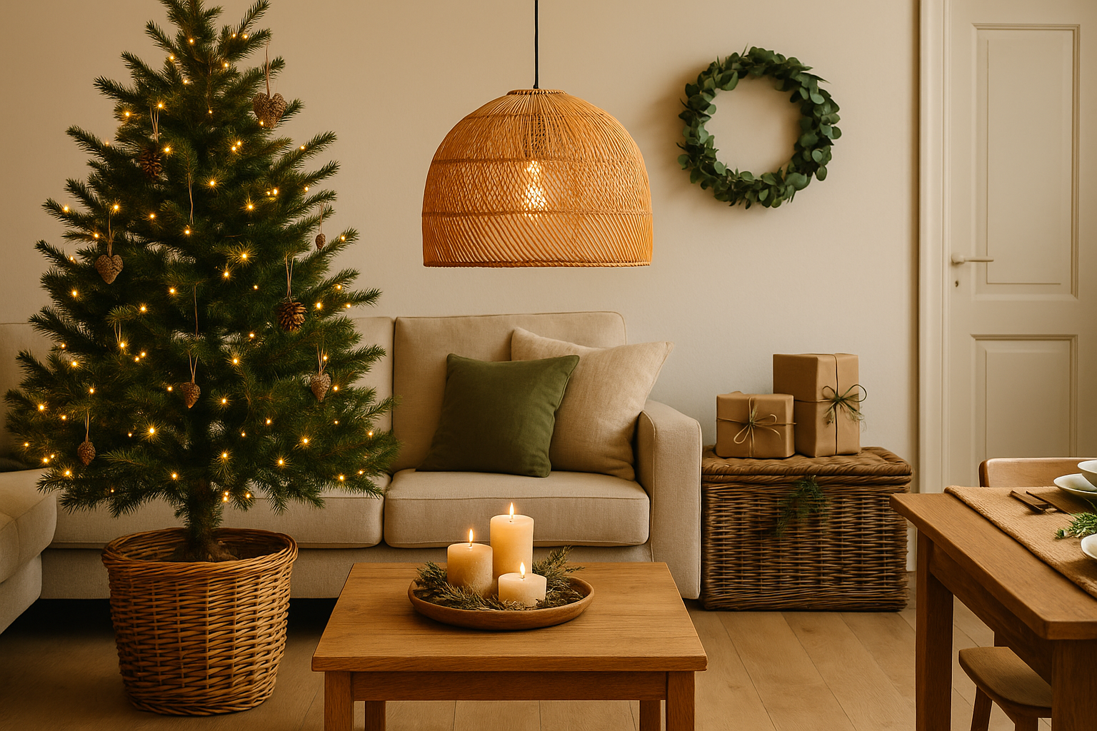 Crea un rincón cálido con una cesta de mimbre grande llena de piñas, ramas de abeto y luces LED cálidas. Añade una bandeja de madera con velas aromáticas sobre la mesa de centro y algunos cojines de lino en tonos beige o verde oliva.